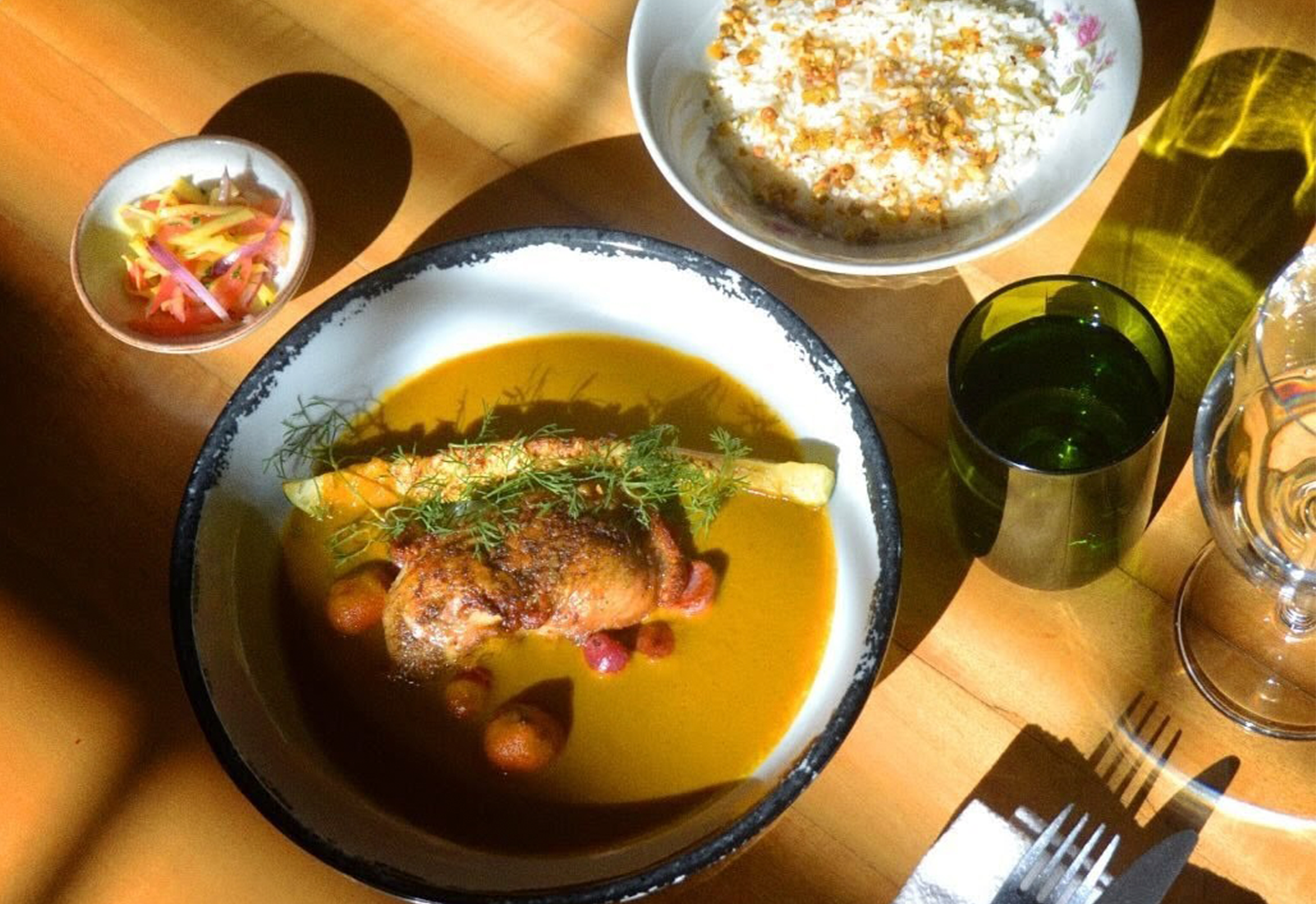 A shared table experience featuring the dishes cooked together, paired with drinks and a signature cocktail